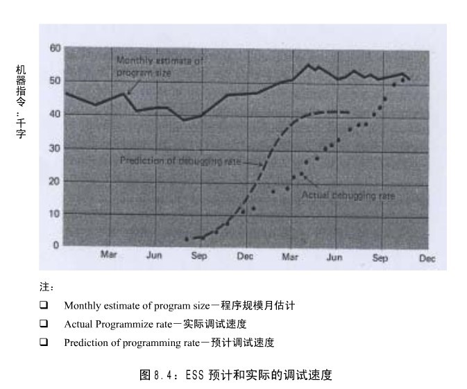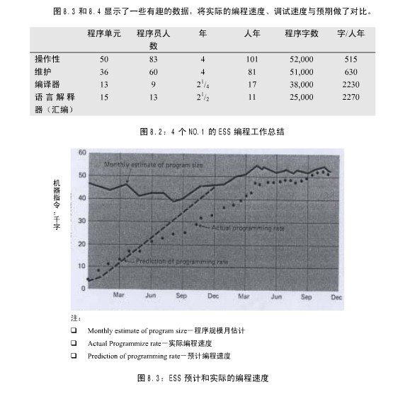 这些图中,图 8.2 是最数据详细和最有用的。头两个任务是基本的控制程序,后两个是基本的语言翻译。生产率以经调试的指令/人年来表达。它包括了编程、构件测试和系统测试。没有包括计划、硬件机器支持、文书工作等类似活动的工作量。